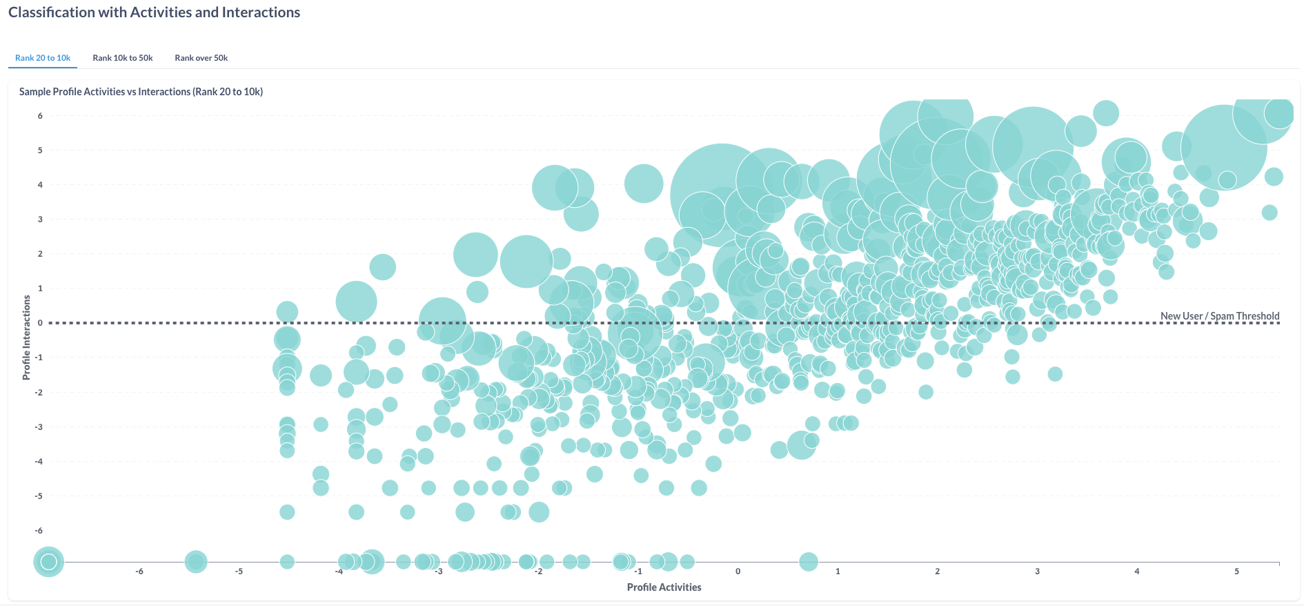 <figure><img src="https://content.gitbook.com/content/EtcdATXDvC0WSePF1xED/blobs/UuESsTxuI6DfHsRU7Kx4/image.png" alt=""><figcaption><p>Classification of High ranked profiles, with most profiles in this cohort reaching higher levels of engagements, as shown above the Y-axis "Spam Threshold" threshold</p></figcaption></figure>