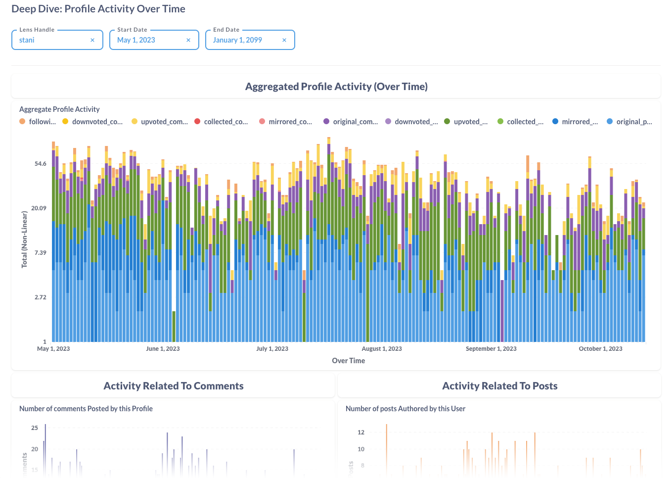 We also looked at how many types of interactions a Lens profile receives, across all types of interactions on their profile and content — whether they are followed by others, or their posts are mirrored, liked or commented by others. The inherent reputation of other profiles interacting with a profile of interest, is what we've surfaced in this most recent iteration in this visualization.