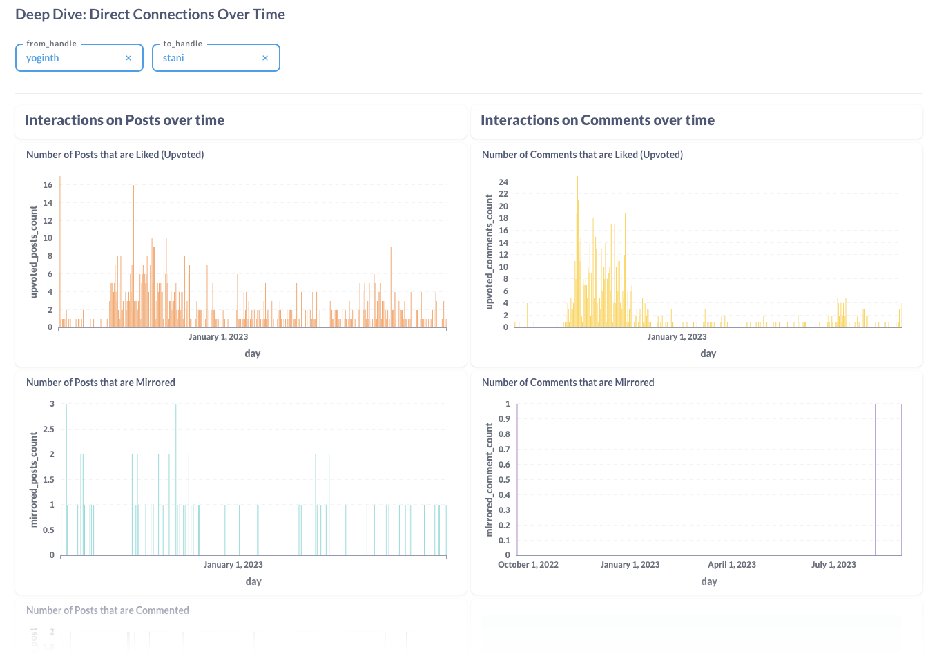 How about the relationships between one profile with another?  If you'd like to discover how posts and comments are interacted upon by a single profile with another, we have that here as well, plotted over time